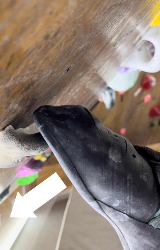 ただし、スラブや垂壁と違って、強傾斜ではだいたい①シューズの先端と、②拇指球と親指の腹の間しか使いません(あくまで筆者は)
